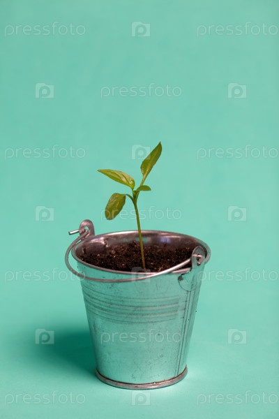 Выращивание рассады в миниатюрном металлическом ведерке. Зеленые ростки саженца. Крупный план