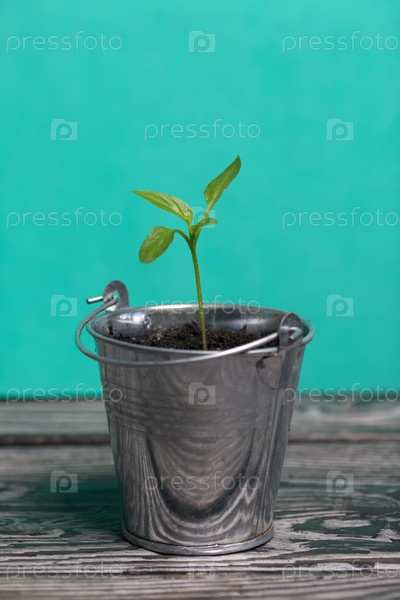 Выращивание рассады в миниатюрном металлическом ведерке. Зеленые ростки саженца. Крупный план