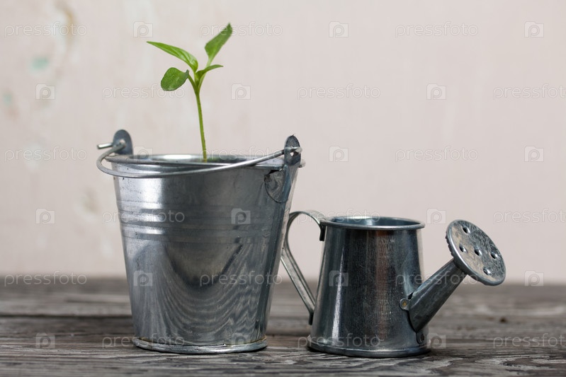 Выращивание рассады в миниатюрном металлическом ведерке. Рядом с ним миниатюрная лейка. Зеленые ростки саженца. Крупный план