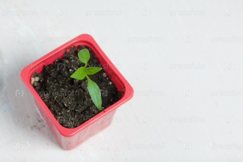 Выращивание рассады в пластиковом контейнере. Зеленые ростки саженца. Крупный план