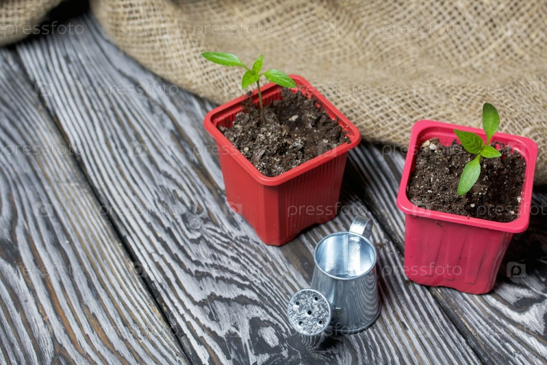 Зеленые ростки саженца. Выращивание рассады в пластиковом контейнере. Рядом с ним миниатюрная лейка. Крупный план