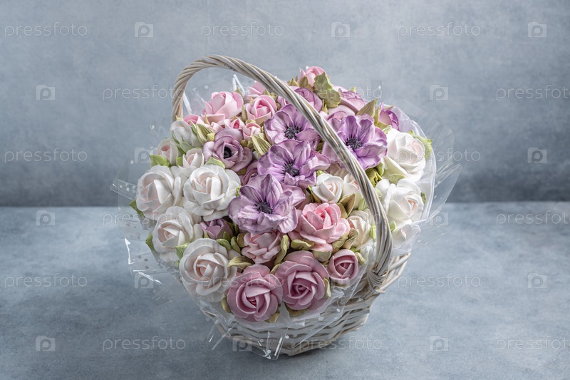 Зефирный букет цветов в корзине на светлом фоне, сладости для гурманов