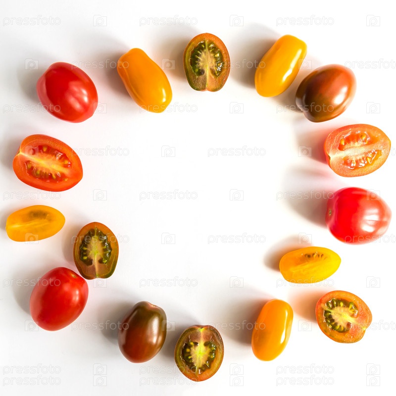 Различные красочные помидоры, изолированные на белом фоне. Овощная рамка с копировальным пространством. Вид сверху, плоская планировка. Креативный макет
