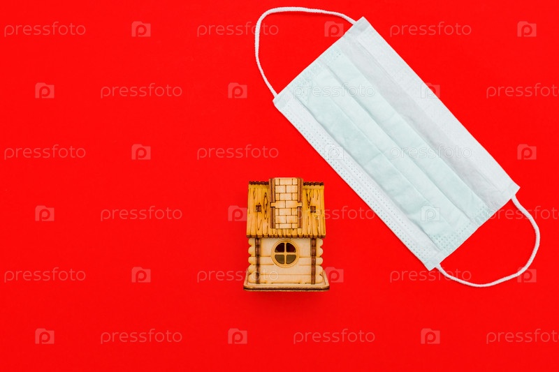 Медицинская маска и деревянный игрушечный домик на красном фоне. концепция самокарантина дома как профилактическая мера против вспышки вируса