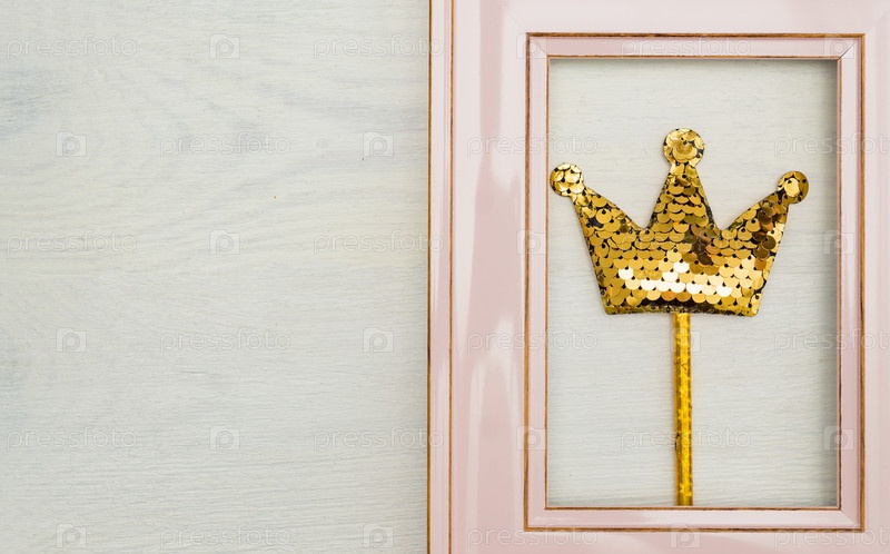 Розовая фоторамка с короной из золотых блесток на белом деревянном фоне. Минимальная плоская планировка с копировальным пространством