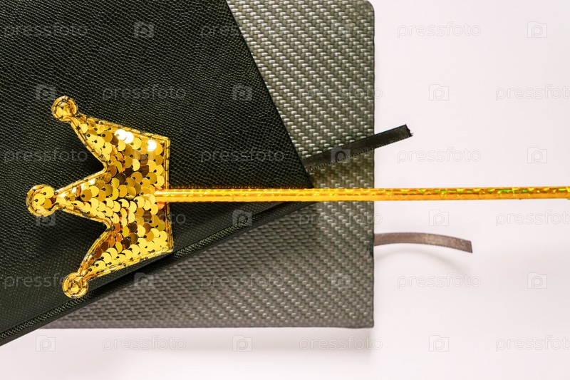 Пара личных планировщиков и чудо-палка с золотой короной из блесток на белом фоне