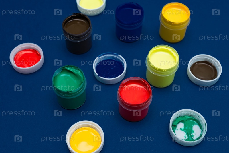 Крупный план открытых банок с акриловой краской. Красочные краски на синем фоне
