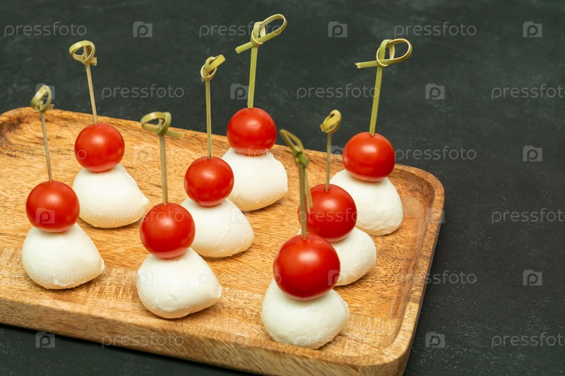 Шарики моцареллы с помидорами черри на шпажках, канапе на черном фоне, сыр с овощами