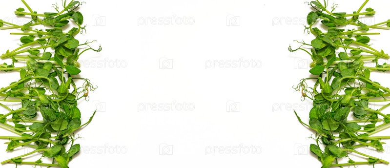 Куча органических свежесобранных ростков снежного гороха на белом фоне. Баннер