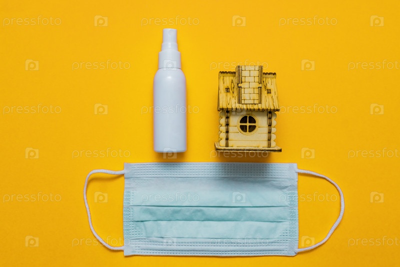 Дезинфицирующее средство, деревянный дом и защитная маска на желтом фоне. Концепция изоляции и домашнего лечения во время пандемии коронавируса