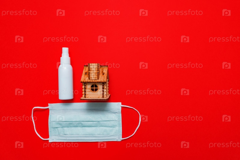 Деревянный дом, дезинфицирующее средство и защитная медицинская маска на красном фоне как символ поведения на карантине во время пандемии коронавируса