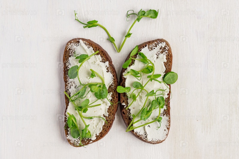 Два бутерброда из черного ржаного хлеба с свежим сливочным сыром и зеленым органическим горохом Microgreens. Здоровый завтрак. Вид сверху
