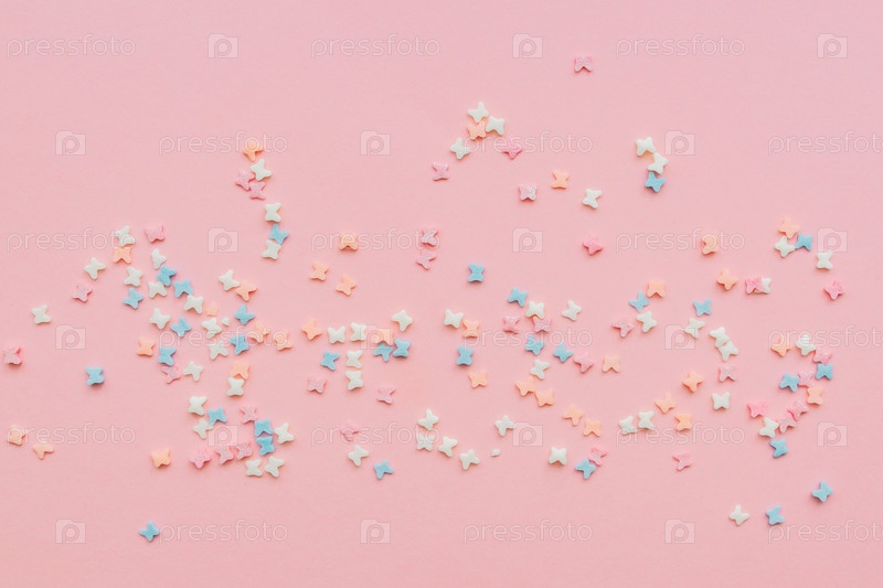 Окропляет фон, бабочки, посыпанные сахаром, украшение для торта и пекарни. Вид сверху, плоская планировка. пастельные тона