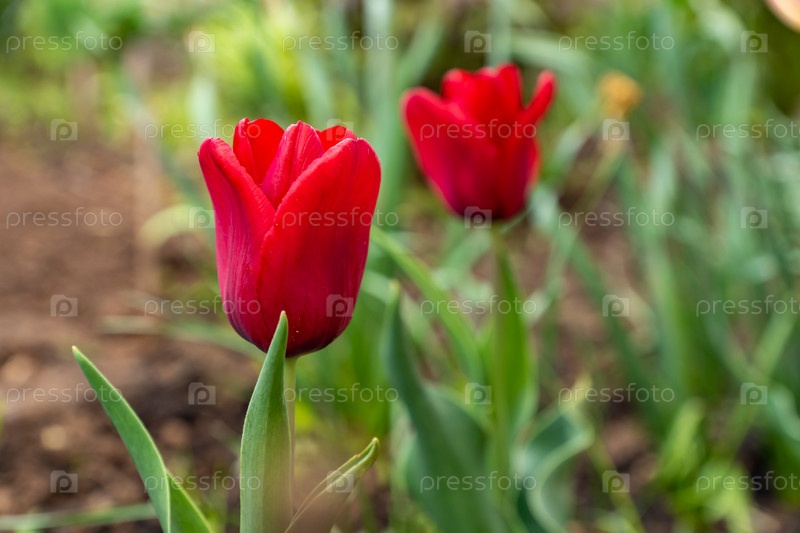 Красный цветущий тюльпан в саду в дождливый день. копировать пространство