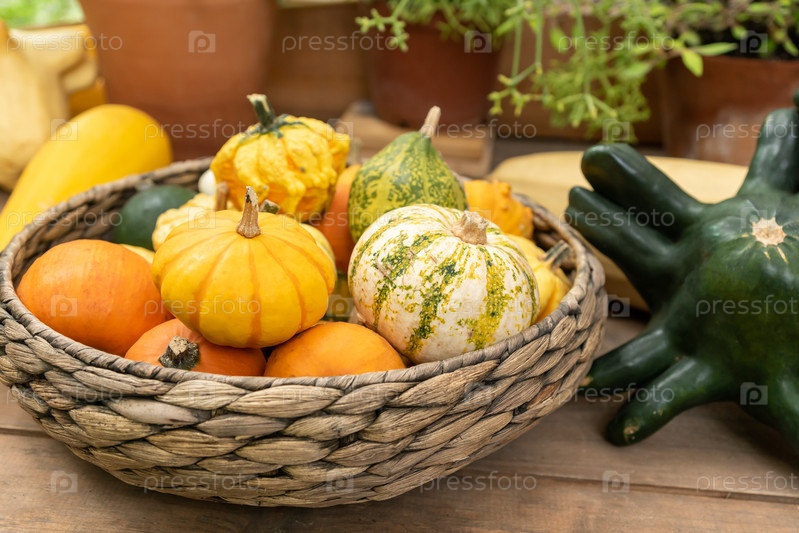 Осенний урожай на фермерском рынке. Декоративные тыквы в корзине