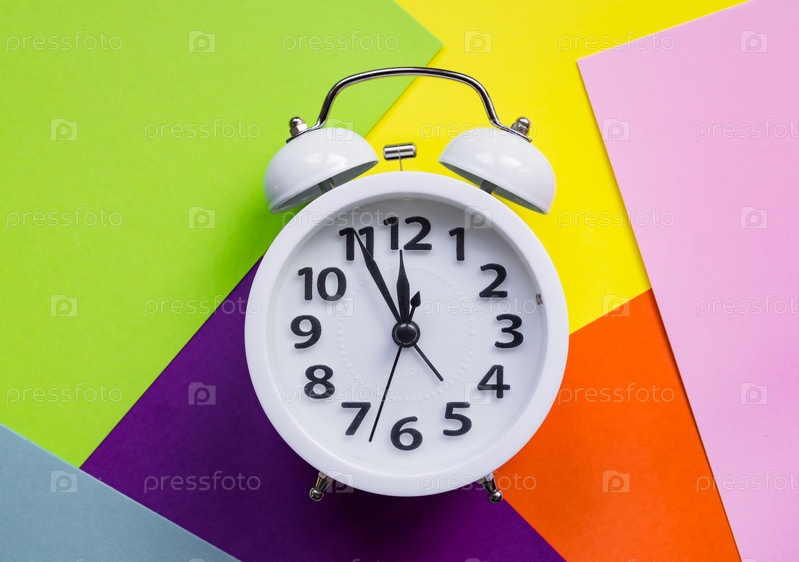 Плоский белый новый будильник на ярком разноцветном фоне