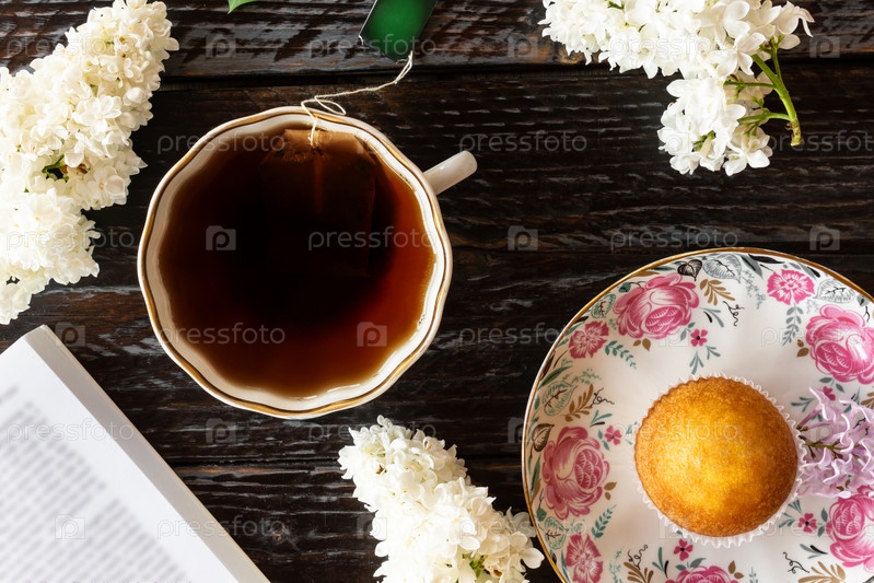 Вид сверху на сиреневые цветы. чашка черного чая, открытая книга и кекс на темном деревянном фоне