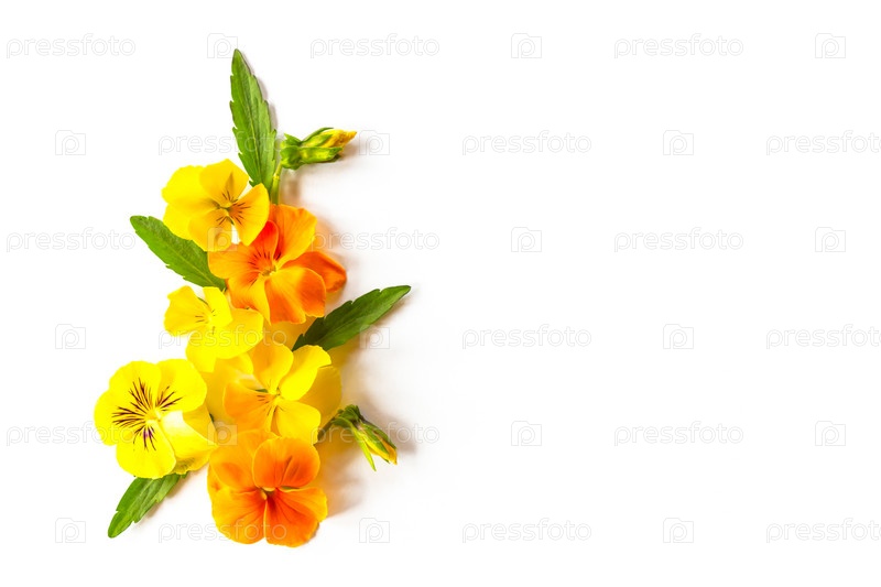 Цветочная рамка с красивыми оранжевыми и желтыми фиалками или цветами анютиных глазок на белом фоне с копировальным пространством