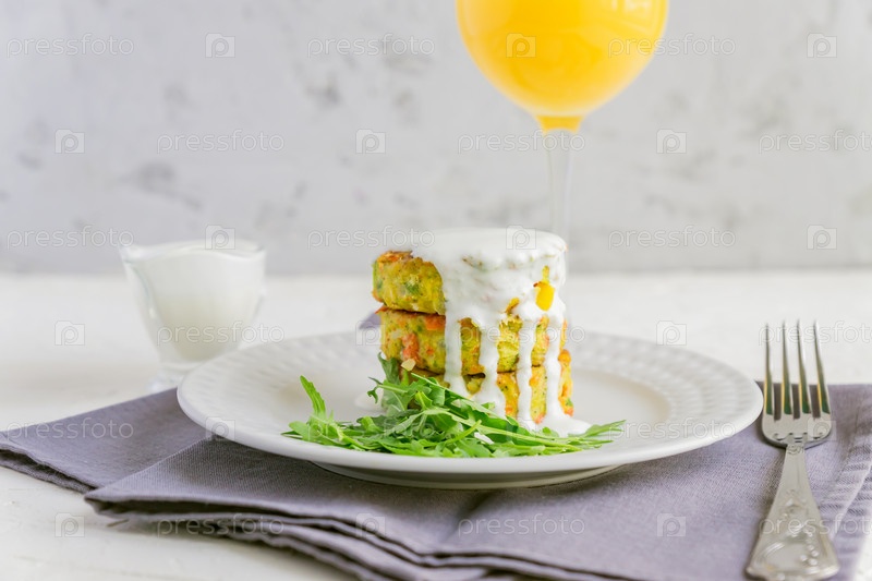 Веганские овощные бургеры с салатом из рукколы и соусом, подаваемые в белой тарелке и апельсиновым соком, пространство для копирования