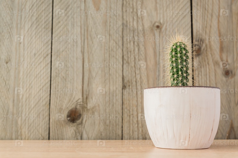 Маленький кактус цереус в горшке на деревянном фоне. Домашнее садоводство, деревенский стиль, место для копирования текста