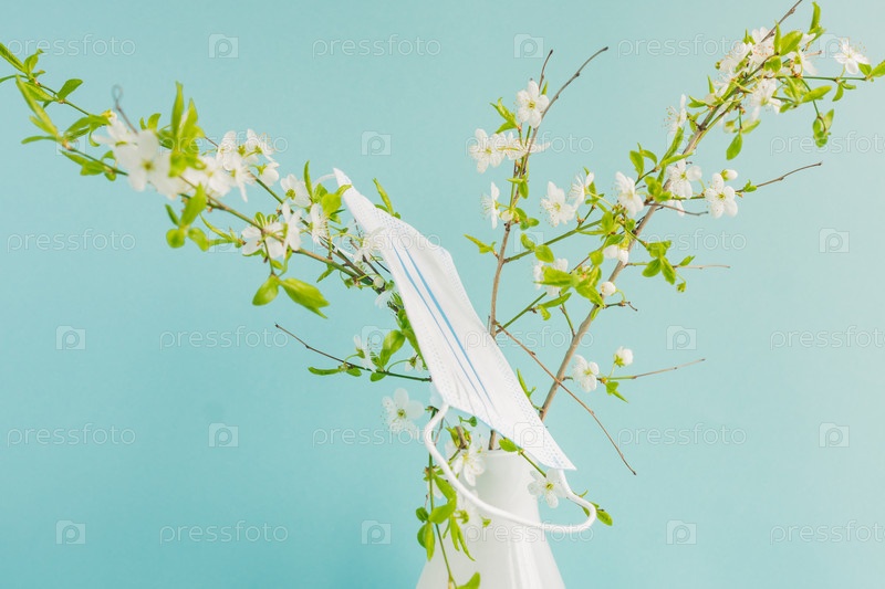 Весенняя цветущая вишня и лекарственная маска на ветке. Концепция аллергии на весеннее цветение