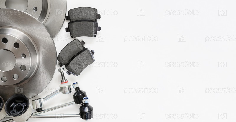 Автозапчасти для автосервиса на белом фоне. Тормозные диски и другие детали. копирайт