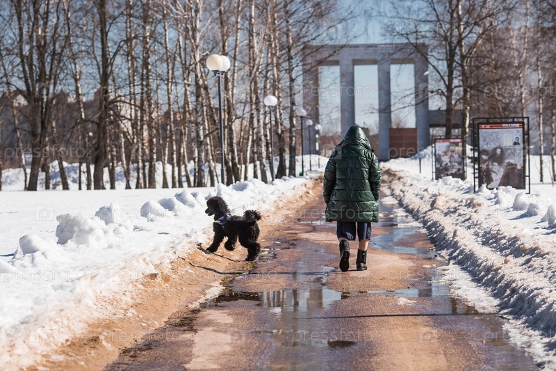 Хозяин гуляет с пуделем в городском парке солнечным весенним днем