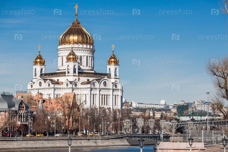 Русский православный собор - собор Христа Спасителя в Москве на фоне голубого неба в солнечный весенний день. Российская Федерация, Москва