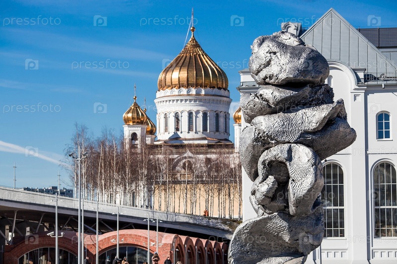 Памятник в Москве на Болотной набережной Урса Фишера «Большая глиняная №4» на фоне Храма Христа Спасителя в ясный весенний день