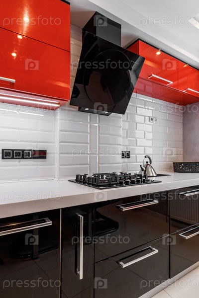 Современный интерьер кухни с красными и черными шкафами и белым керамическим полом