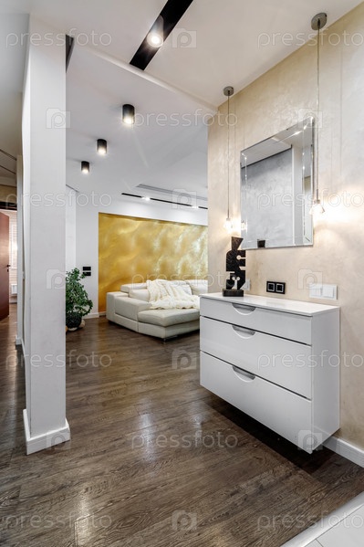 Вид на гостиную и коридор в современной квартире из прихожей