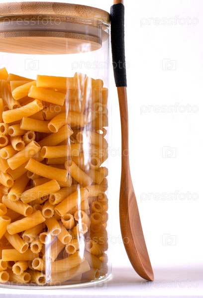 Макаронные изделия макарон в стеклянной банке и деревянной ложкой на белом фоне. Хранение продуктов