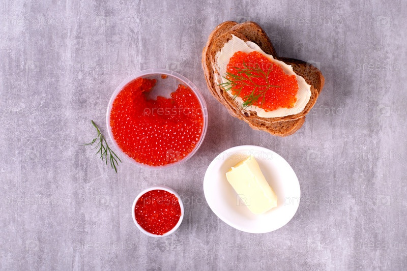 Бутерброд с красной икрой и маслом на сером столе. Вид сверху