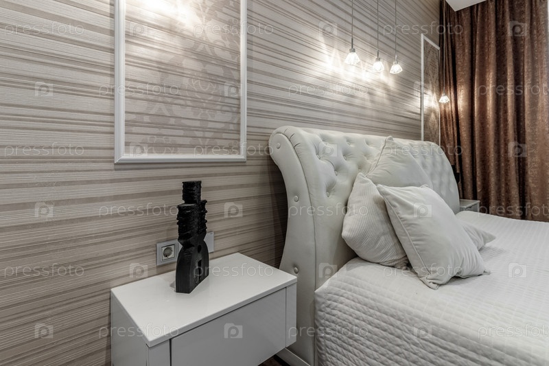 Светлая спальня с большой белой кроватью и изголовьем капитоне