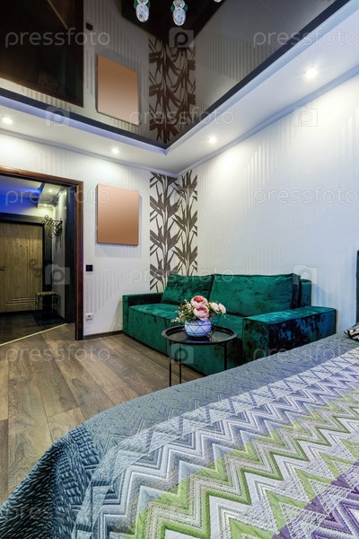 Кровать и зеленый диван в современной комнате с букетом цветов на черном журнальном столике