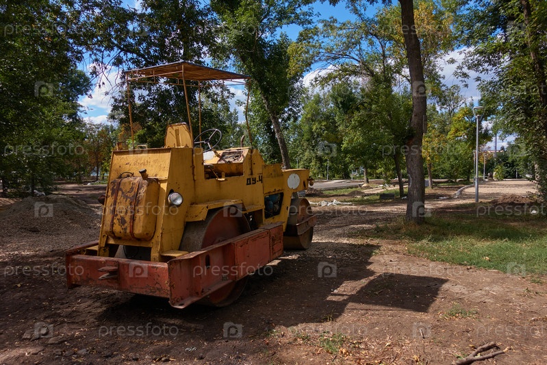 В обновленном парке стоит старый асфальтовый каток. Который работает до сих пор