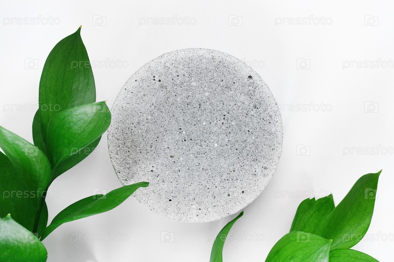 Подиум из бетона с зелеными листьями для презентации упаковки и косметики, вид сверху, на белом фоне. Дисплей продукта с белой бетонной текстурой, каменной текстурой