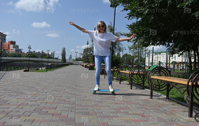 Активная женщина средних лет едет на скейтборде по пустой дороге или шоссе. Обычная городская женщина отдыхает на скейтборде после работы. Концепция современного образа жизни