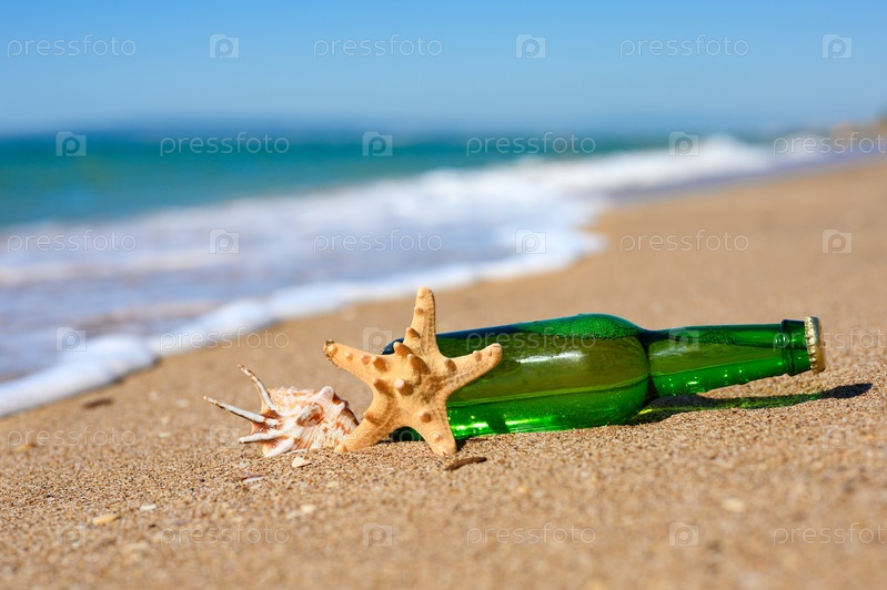 Бутылка пива и ракушки на песчаном берегу