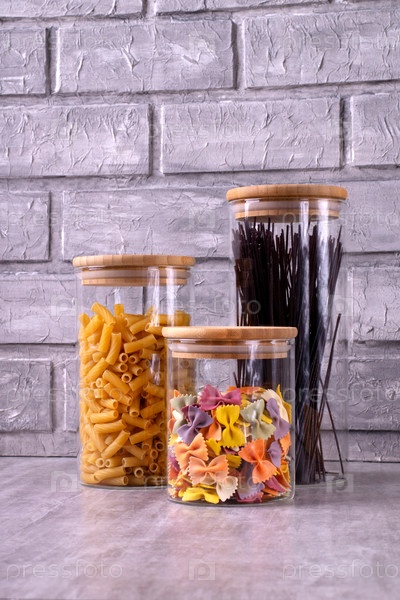 Хранение макарон трех видов в стеклянных банках у серой кирпичной стены. Хранение продуктов