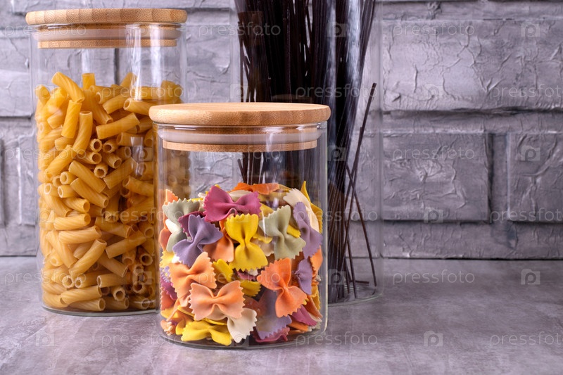 Хранение макарон трех видов в стеклянных банках у серой кирпичной стены. Хранение продуктов