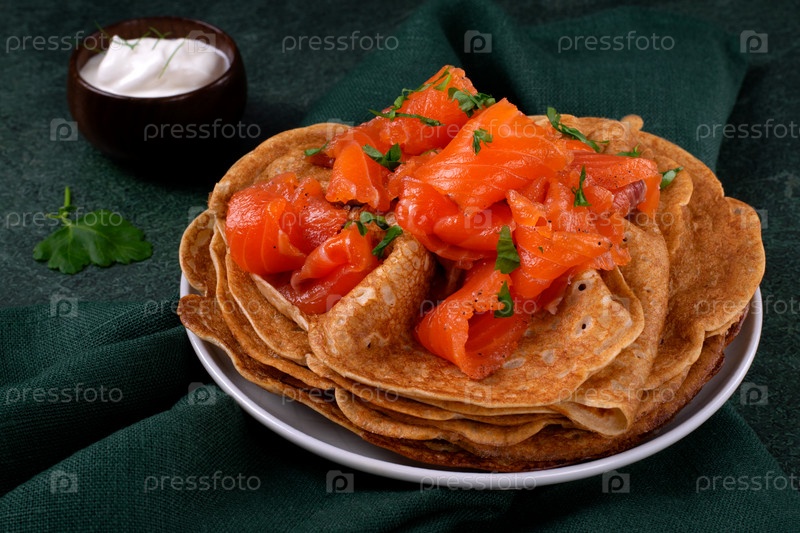 Ржаные блины на закваске с соленой форелью и сметаной на темно-зеленом столе. Традиционная русская еда. Празднование Масленицы