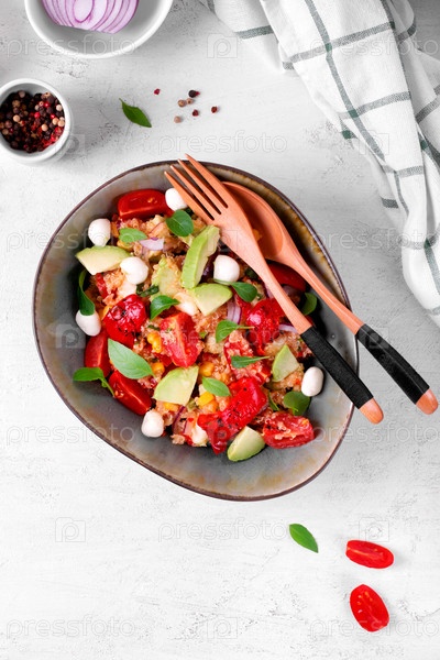 Салат с киноа, авокадо, помидорами черри, кукурузой, перцем на гриле и моцареллой с зеленью в миске на белом столе. Здоровая еда с различными ингредиентами. Вид сверху