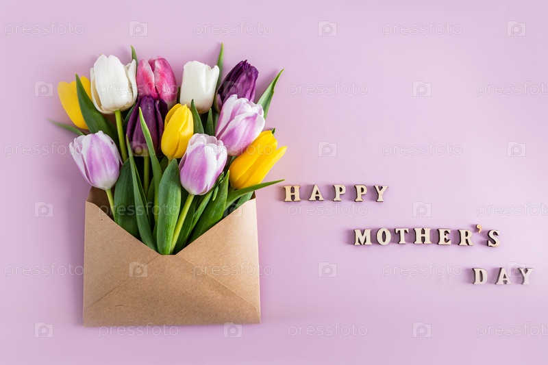 Креативная композиция к празднику дня матери. много ярких весенних цветов в ремесленном конверте. плоская кладка. письма деревянные с днем матери