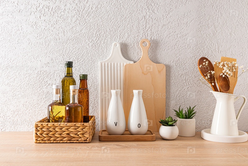 Вид спереди на современную кухонную столешницу с местом для хранения продуктов и разделочными досками. концепция правильного рационального хранения