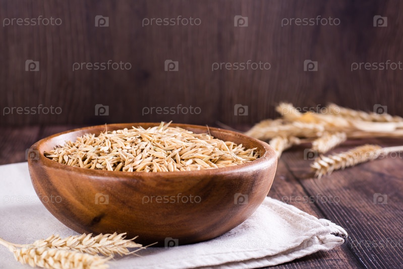 Семена овса в деревянной миске и колосья на столе. Органический урожай