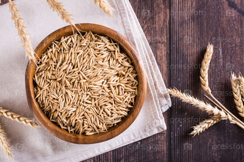 Семена овса в деревянной миске и колосья на столе. Органический урожай. Вид сверху