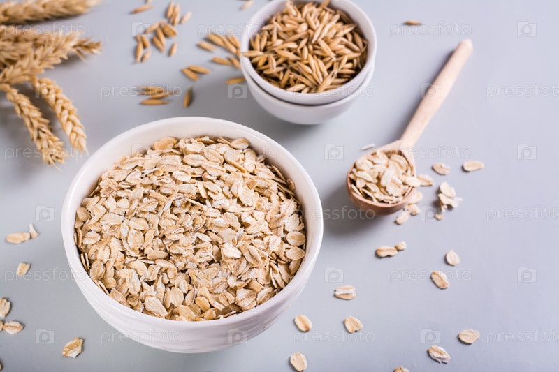 Тарелка с сухой овсянкой и колосьями овса на сером фоне
