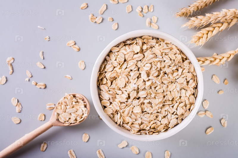 Крупный план сырой овсянки в миске с деревянной ложкой и ушами на сером фоне. Вид сверху