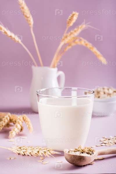 Домашнее овсяное молоко в стакане и овсянка на столе. Альтернатива лактозе. Вертикальный вид